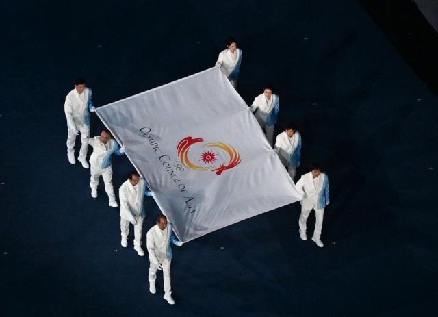 9月23日,亚奥理事会会旗在开幕式上入场。新华社记者徐子鉴摄
