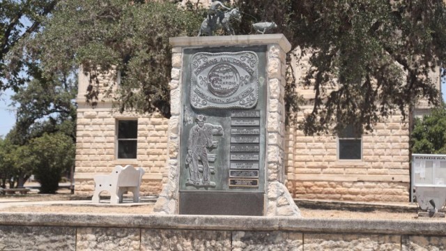 美国得克萨斯州班德拉法院楼前的一块青铜碑,上面镌有“世界牛仔之都”字样和多个牛仔竞技世界冠军的名字。