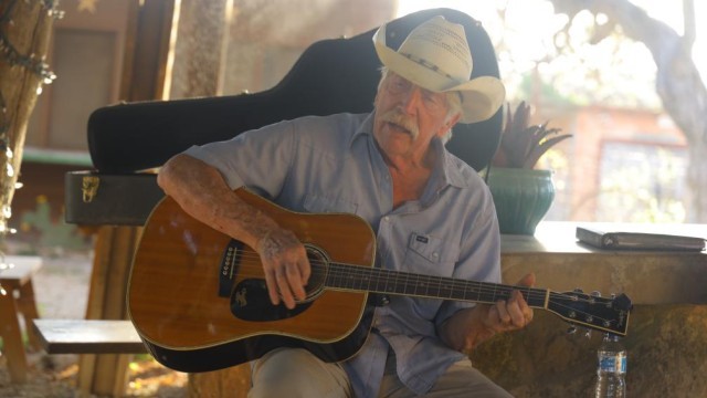 在迪克西杜德牧场演唱牛仔歌曲的音乐家卢·皮尤特尔鲍。