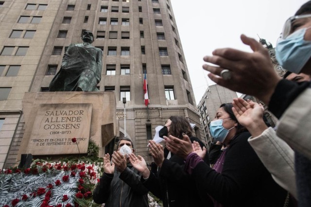 2021年9月11日,民众在智利首都圣地亚哥宪法广场的前总统阿连德雕像前集会,纪念阿连德遇难48周年。(新华社发,豪尔赫·比列加斯摄)