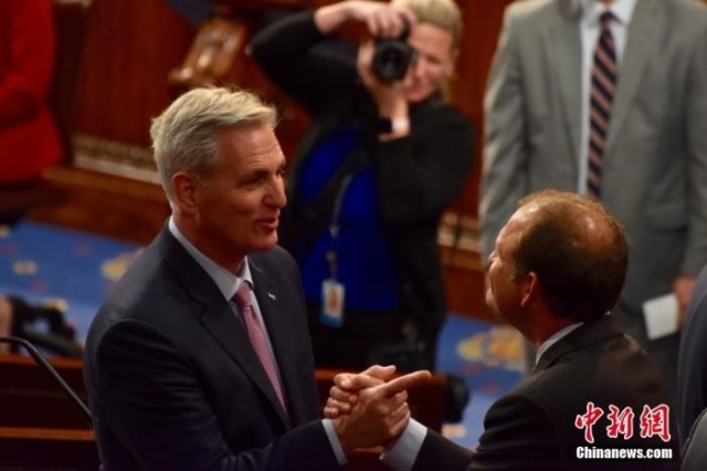 资料图:美国国会众议院议长麦卡锡(左)。 中新社记者 沙晗汀 摄