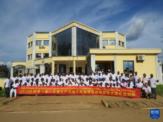 这是2019年11月19日,在刚果(布)首都布拉柴维尔以南17公里的中国援刚果(布)农业技术示范中心,中国热带农业科学院专家为当地农民开办刚果(布)木薯生产与加工及热带果树种植技术海外培训班时合影留念。新华社发(中国热带农业科学院供图)