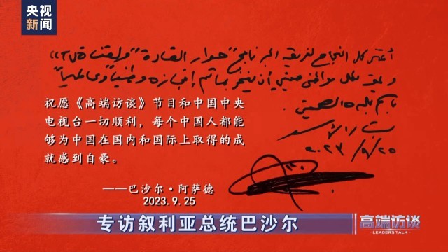 叙利亚总统巴沙尔在接受总台专访后题词:祝愿《高端访谈》节目和中国中央电视台一切顺利,每个中国人都能够为中国在国内和国际上取得的成就感到自豪!