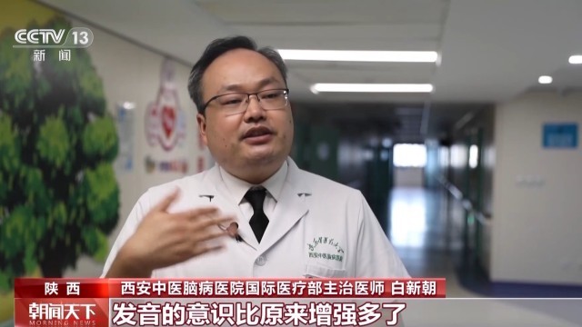 西安中医脑病医院国际医疗部主治医师 白新朝:有时偶尔会把爸爸妈妈这个声音能发出来,发音的意识比原来增强多了。