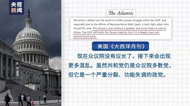 美国《大西洋月刊》评论说,现在众议院没有议长了,接下来会出现更多混乱。虽然共和党仍是众议院多数党,但它是一个严重分裂、功能失调的政党。