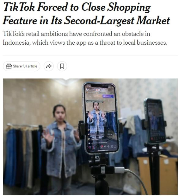 一位名叫Dennies的印尼商户在接受《纽约时报》采访时表示,政府关停TikTok Shop印尼业务,想要保护的根本不是本地中小商家,而是其他电商平台。Dennies此前通过TikTok Shop售卖皮包和手提箱等商品,营业额是其他电商平台的3倍。印尼新规出台后,Dennies随即失去了这部分收入。
