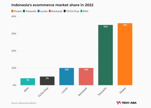 据科技网站“Tech in Asia”报道,印尼市场排名前三的电商平台是Shopee、Tokopedia和Lazada,去年它们在印尼的市场份额分别为36%、35%、10%,三者都是纯电商平台。
