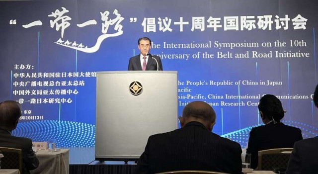 10月13日,“一带一路”倡议十周年国际研讨会在日本东京举行。图为中国驻日本大使吴江浩在现场发表主旨演讲。中青报·中青网记者贾沂蒙/摄