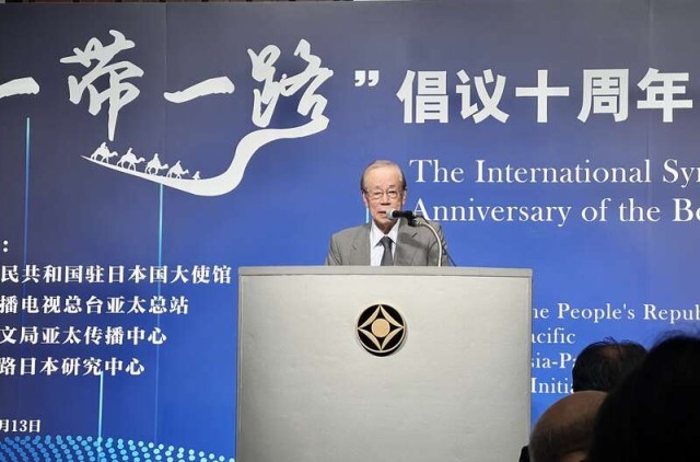 中国青年报客户端东京10月13日电(中青报·中青网驻日本记者 贾沂蒙)10 月13 日,“一带一路”倡议十周年国际研讨会在日本东京举行。中国驻日本大使吴江浩、日本前首相福田康夫、日本经济团体联合会副会长佐藤康博、“一带一路”日本研究中心代表进藤荣一、泰中“一带一路”研究中心主任威伦等出席并致辞。