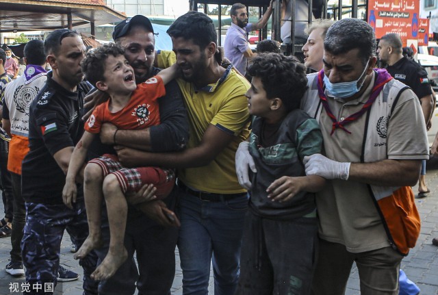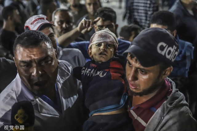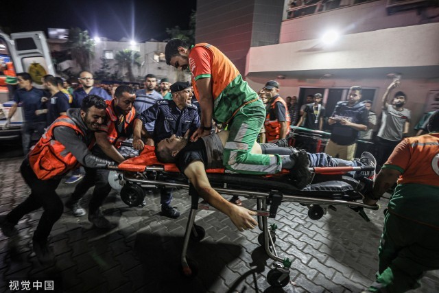 当地时间2023年10月17日,加沙城,巴勒斯坦人将一名受伤儿童抬到加沙城的医院。