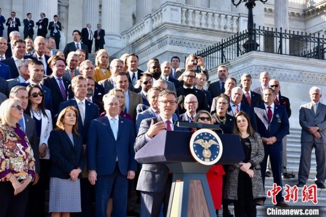 约翰逊当选议长后在记者会上表示,过去几周的议长选举让共和党人“更强大”,“我们将立刻全力以赴开始工作”。 中新社记者 沙晗汀 摄