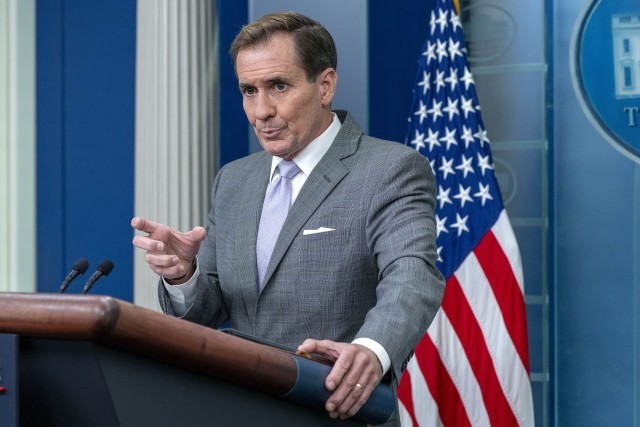当地时间2023年10月23日,美国华盛顿特区,美国国务院新闻发言人约翰·柯比在白宫举行的新闻发布会上发表讲话。