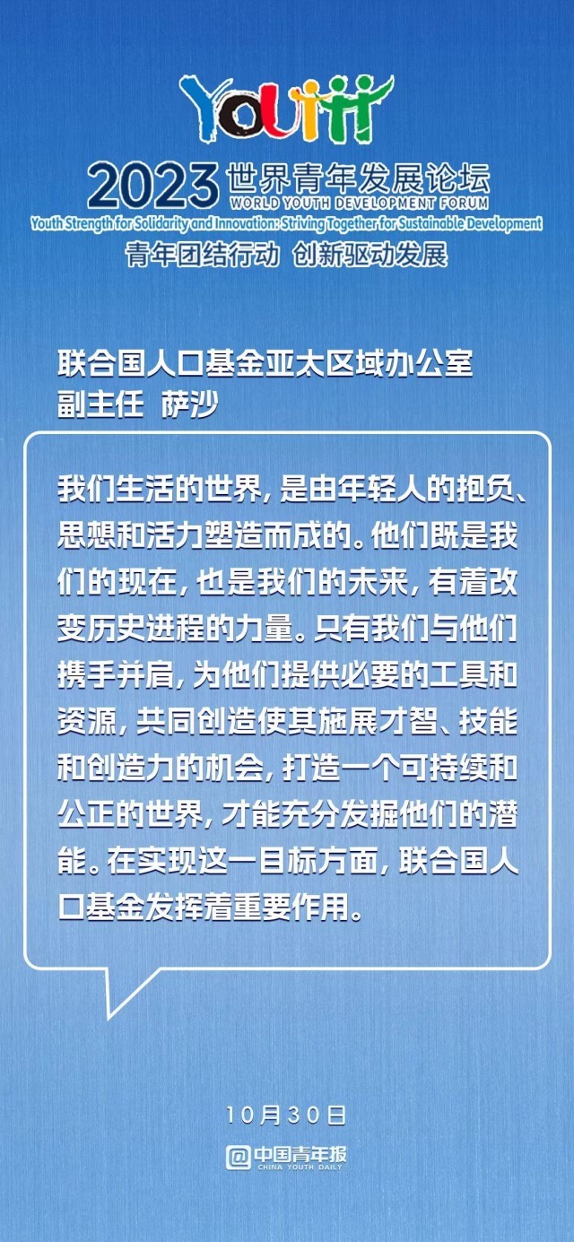 联合国人口基金亚太区域办公室副主任萨沙在2023年世界青年发展论坛上发表主旨演讲