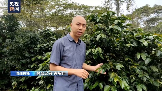 总台记者 肖贺佳:这个农场海拔非常高,在1600米左右,所以我手边的这个咖啡植株也就是高海拔咖啡,这也意味着它的生长期更长,成熟得更慢。大家可以看到这些咖啡豆(果实)还都是绿色的,说明它们都还是生的,等它们完全成熟可能要到明年的1月底2月初,那时候这些咖啡果实就会完全变成红色。