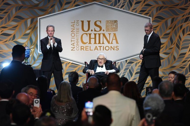 10月24日,美国前国务卿基辛格(中)出席在纽约举行的美中关系全国委员会年度颁奖晚宴。新华社记者李睿摄