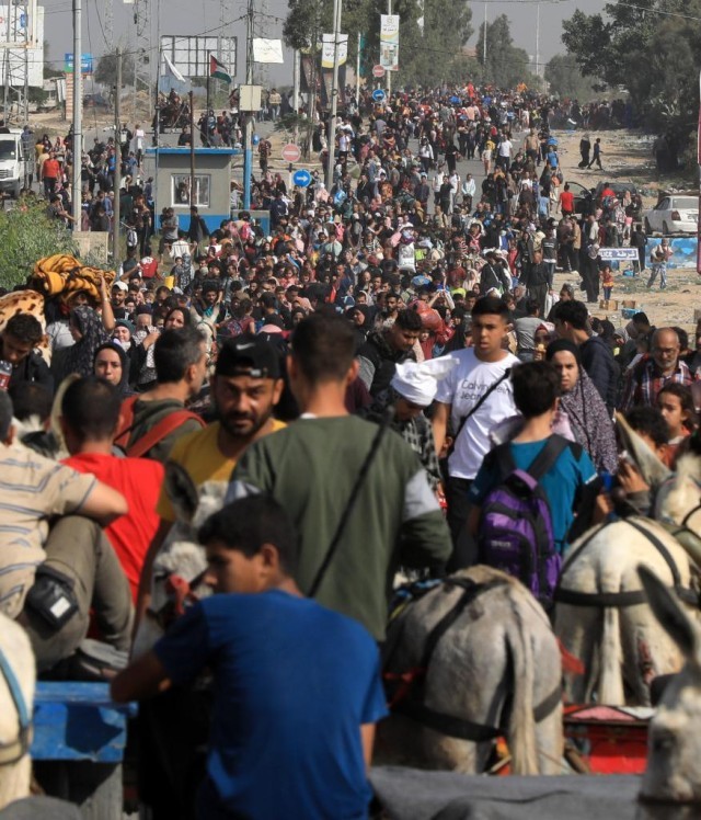 11月10日,在加沙地带中部地区,加沙地带北部的民众被迫向南撤离。新华社发(亚西尔·库迪摄)
