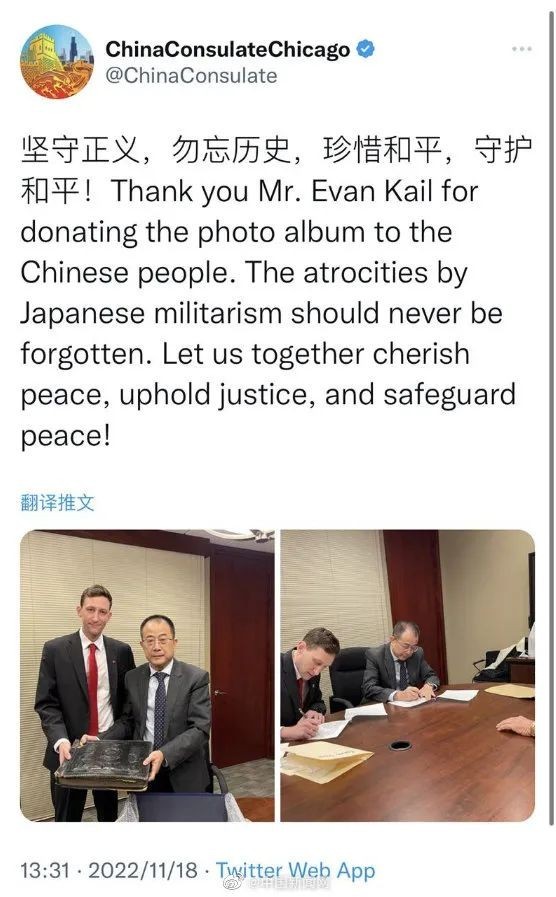 中国驻芝加哥总领事馆在回赠埃文的感谢信中称,历史是当今社会的一面镜子,埃文的捐赠将激励世人以善良之心维护和平,领事馆也会继续为中美人民之间的文化联系和友谊而努力。