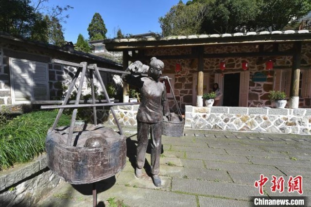 11月18日,福州鼓岭山居生活博物馆门口,记者看到一座女挑工雕塑,一边挑筐内有一个襁褓里的男婴,原型就是曾任美国飞虎队中尉的穆蔼仁家族的穆彼得。 中新社记者 张斌 摄