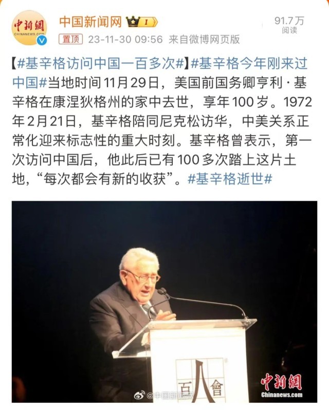 据央视新闻客户端消息,当地时间11月29日,美国前国务卿亨利·基辛格在康涅狄格州的家中去世,享年100岁。