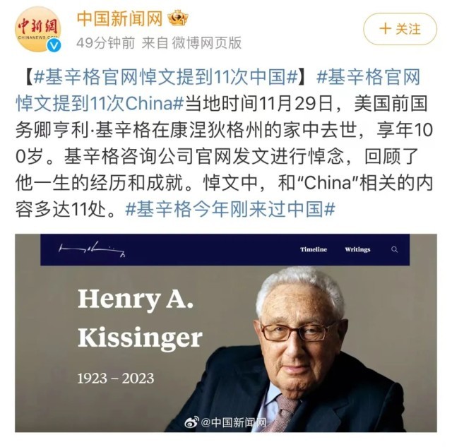 王毅在会见基辛格时表示,基辛格博士为中美关系“破冰”发展作出了历史性贡献,为增进两国相互了解发挥着不可替代的作用,中方珍视同老朋友建立的友谊。他指出,美国对华政策需要“基辛格式”的外交智慧,需要“尼克松式”的政治勇气。当地时间11月29日,基辛格咨询公司官网发文进行悼念,回顾了他一生的经历和成就。悼文中,和“China”相关的内容多达11处。