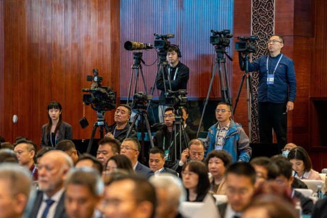 2023年12月5日,记者在云南昆明采访第五届世界媒体峰会(云南分会场)暨第二届大象国际传播论坛开幕式。新华社记者 胡超 摄