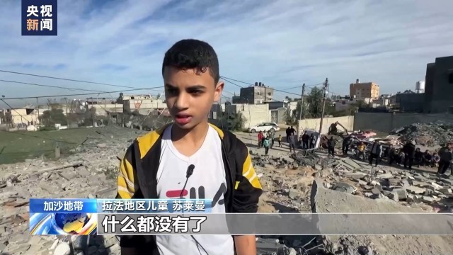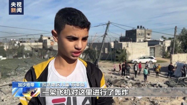 拉法地区儿童 苏莱曼:晚上我们正在睡觉的时候,一架飞机对这里进行了轰炸,当时就像地震了一样。你可以看到这里被破坏的程度,很多房屋都被摧毁了。看看那里,这里的人究竟做错了什么,要承受这一切。