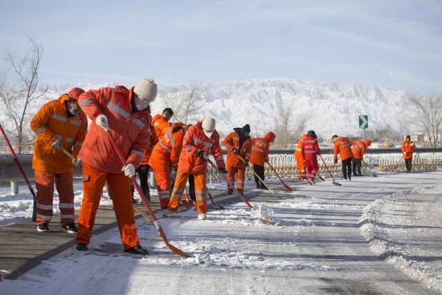 12月16日,甘肃省武威公路事业发展中心民勤公路段职工在武威高速匝道口进行除雪防滑作业。为应对近期大范围寒潮和低温雨雪冰冻天气,各地、各部门采取多种措施,全力保障人民群众安全温暖过冬。(新华社发)