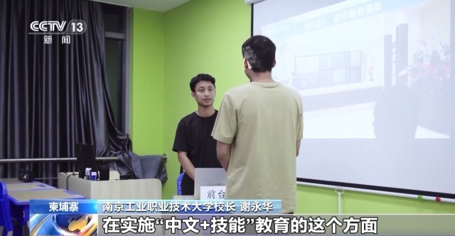 南京工业职业技术大学校长 谢永华:之前我们就跟柬埔寨在实施“中文+技能”教育的方面,开展了深入的合作,今年成立的第一所海外应用大学,主要还是来培养高层次的技术技能人才。采用的模式有4+0,2+2,3+1,也是我们鼓励我们柬埔寨的优秀学生,能够到中国去学习一年或者是两年,最后毕业的时候获可以获得中柬两国的学历学位证书。