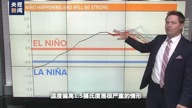 世界气象组织气候服务主任 休伊特:在过去三年里,我们一直处于拉尼娜状态,也就是热带太平洋的海水相对寒冷,这种情况在今年早些时候结束了。现在我们看到热带太平洋中,厄尔尼诺现象越来越严重,热带太平洋中出现了较暖的海水。
