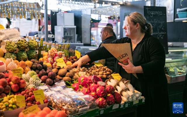 12月20日,在德国法兰克福“小市场大厅”,一名摊主为顾客挑选水果。“小市场大厅”始建于19世纪末,是法兰克福市中心著名的农副产品零售大厅。 新华社记者 张帆 摄
