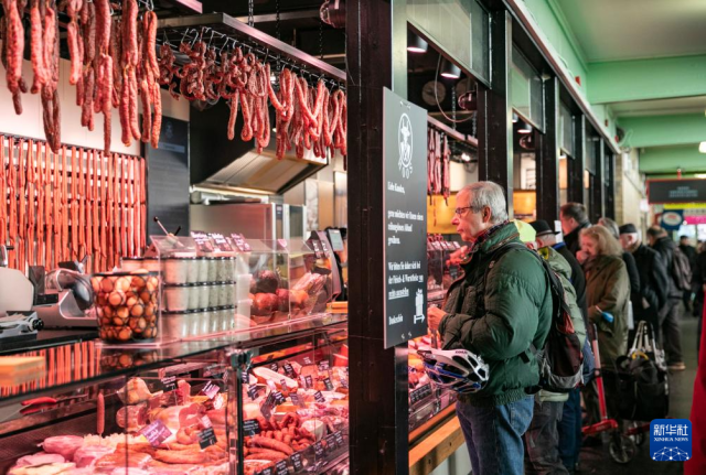 12月20日,人们在德国法兰克福“小市场大厅”排队购买肉制品。“小市场大厅”始建于19世纪末,是法兰克福市中心著名的农副产品零售大厅。 新华社记者 张帆 摄