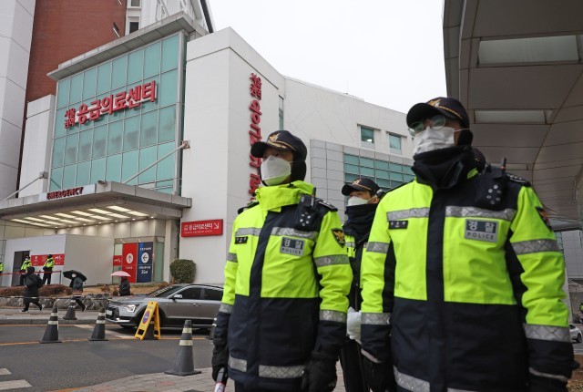 当地时间2024年1月3日,韩国首尔,韩国最大在野党共同民主党党首李在明在釜山出席活动时遇袭颈部被刺伤,经紧急抢救后转至首尔大学医院接受血管重建术,目前正在重症监护室中恢复,警察在医院外执行警戒任务。视觉中国 图