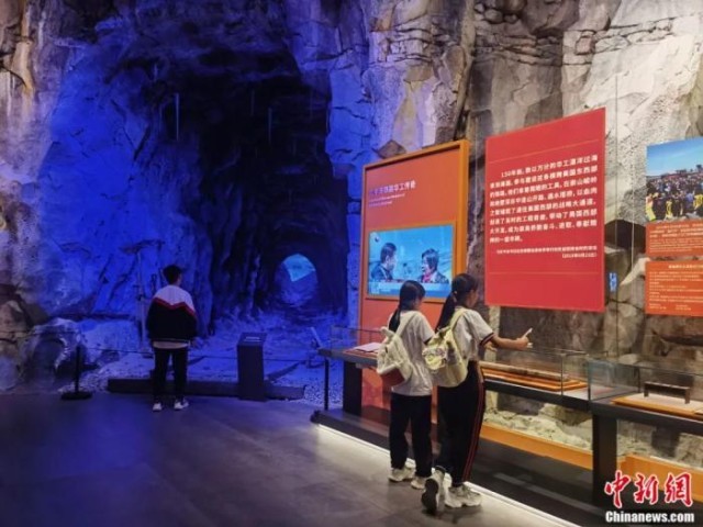 游客在广东江门市博物馆铁路华工展厅观看唐纳峰绝顶隧道模型。江门市博物馆供图