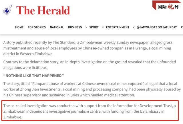 那么,《标准报》为何要发这篇虚假报道?原来,它合作的IDT背景不简单。据《先驱报》报道,2021年9月,该机构邀请津巴布韦和周边国家的12名媒体记者参加了研讨会,给他们分配了“下一阶段任务”——发布涉华负面新闻;同时对他们进行培训,要求瞄准中资企业、重点关注“问题”。文章发表后,记者就能通过代理机构从美国驻津巴布韦使馆,领取每篇1000美元的报酬。
