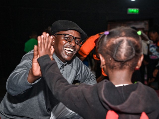 2023年11月18日,在位于肯尼亚首都内罗毕的内罗毕杂技艺术剧院内,卡维塔与一名儿童学生击掌以示鼓励。新华社记者韩旭摄