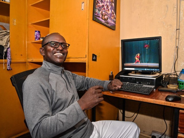 2023年11月18日,卡维塔在内罗毕杂技艺术剧院办公室内展示自己1985年在中国表演杂技的录像。新华社记者韩旭摄