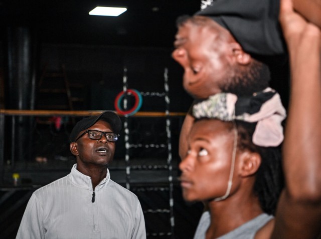 2023年12月4日,在内罗毕杂技艺术剧院,卡维塔指导学生练习头顶人倒立。新华社记者韩旭摄