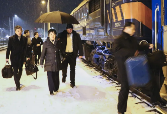 当地时间6日,从波兰乘火车前往乌克兰的日本外相上川阳子。图自日本共同社