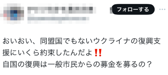 还有网民质问:“喂,为了支援非盟国乌克兰要花多少钱啊!本国的重建却要从普通市民那里募捐?”