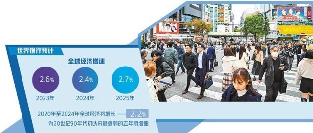 世界银行在当地时间1月9日发布最新一期《全球经济展望》报告,预计2024年全球经济增速将连续第3年放缓,降至2.4%,低于2023年的2.6%,与2023年6月的预测持平;2025年升至2.7%,比此前预期下调0.3个百分点。世界银行预计,2020年至2024年全球经济将增长2.2%,为20世纪90年代初以来最疲弱的五年期增速。