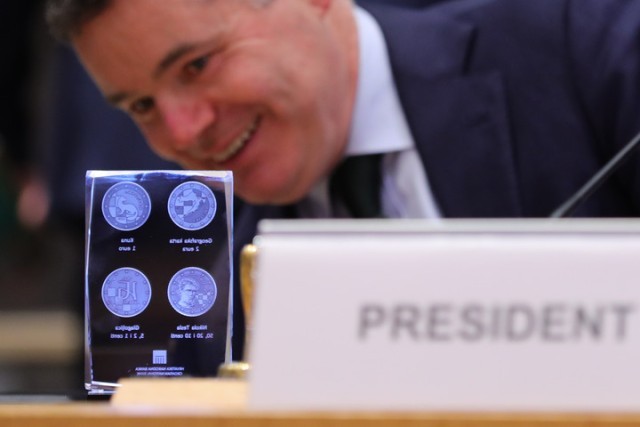 2023年1月16日,欧元集团主席多诺霍在比利时布鲁塞尔的欧元集团会议上观看带有克罗地亚欧元硬币图案的雕塑。(新华社)