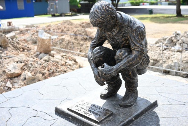 这是2023年12月15日在巴拿马首都巴拿马城拍摄的一尊雕像,雕像前的牌子写着“纪念1989年12月20日的遇难者”。新华社记者陈昊佺摄