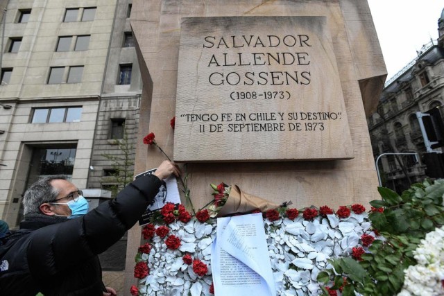 这是2022年9月11日,在智利首都圣地亚哥,民众在前总统阿连德雕像前献花,纪念他遇难49周年。新华社发(豪尔赫·比列加斯摄)