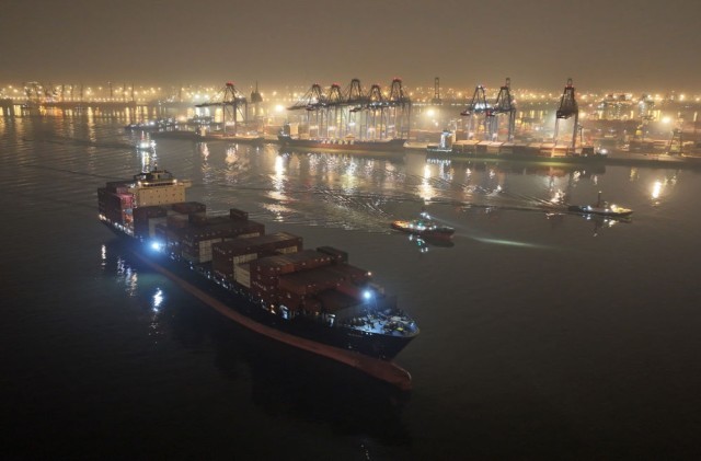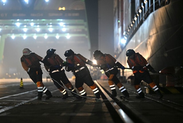 ↑工作人员在为刚靠泊码头的“巴赫”号集装箱班轮固定缆绳
