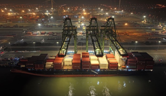 ↑大型集装箱班轮“巴赫”号靠泊在天津港太平洋国际集装箱码头(无人机照片)