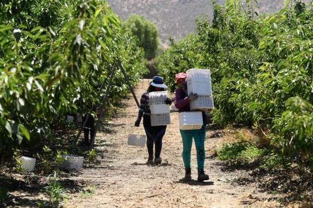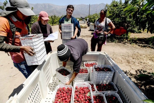 ↑工人在智利首都圣地亚哥附近采摘车厘子