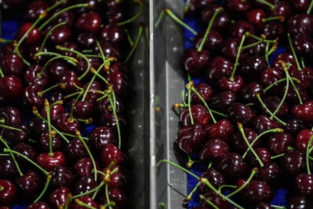 ↑在智利奥希金斯大区拉斯卡夫拉斯一家水果包装厂内,工作人员检查已经装箱的车厘子