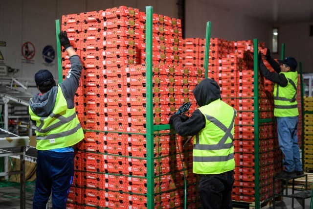 ↑在智利奥希金斯大区拉斯卡夫拉斯一家水果包装厂内,工作人员对车厘子进行打包