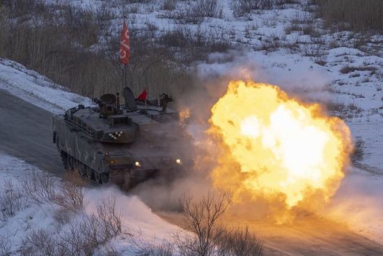 1月25日,韩国京畿道,韩军在抱川市胜进科学化训练场举行射击训练,图为陆军第17师团K1E1战车正在发射炮弹。视觉中国供图