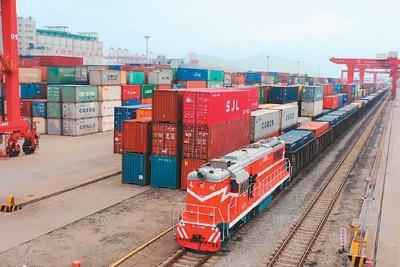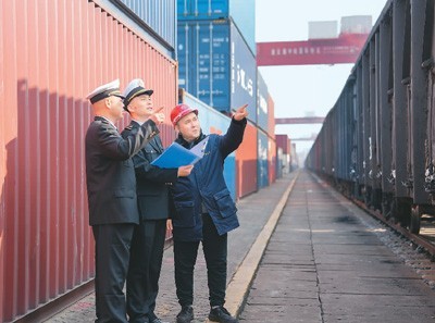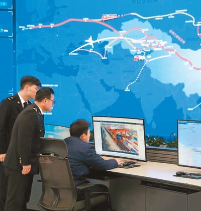 在中哈(连云港)物流合作基地数字化调度中心,海关关员在对中欧班列动态、现场装卸情况等进行实时监控。近年来,连云港海关还创新应用中欧班列“保税+出口”集装箱混拼、“铁路快速通关”等通关便利化举措,不断提升货物通关效率。